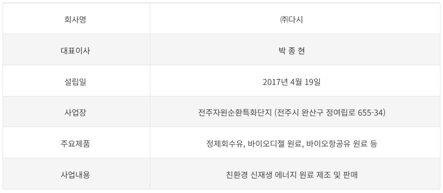 주자원순환특화단지에 위치한 ㈜다시는 폐자원을 전처리 공정을 통해 바이오디젤(BD) 및 지속가능한항공유(SAF) 원료로 연구개발·생산하는 친환경 신재생에너지 자원순환 기업입니다.